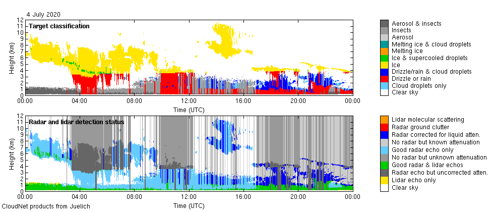 | Linear depolarization ratio | 30 seconds | 1 file per day (30-50 MB) | YYYYMMDD_juelich_categorize.nc | available via Cloudnet |