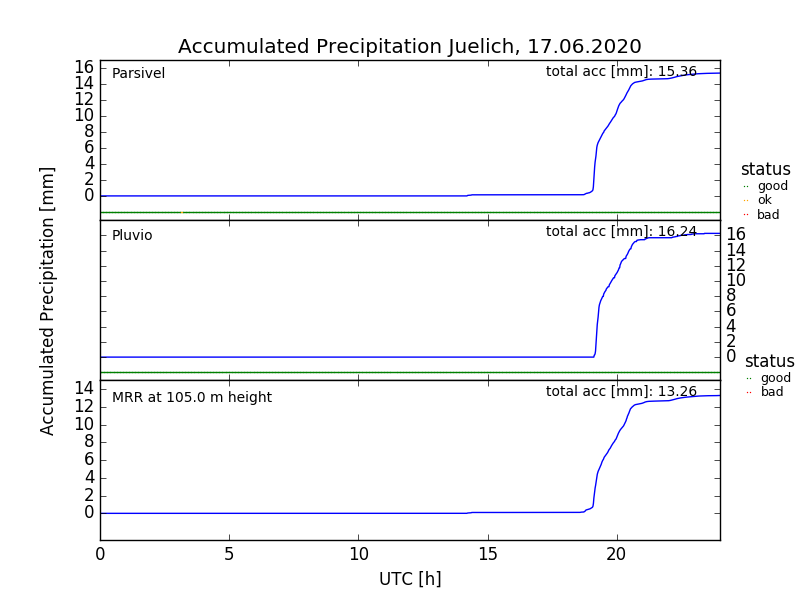Example time series of Pluviometer (left: rain rates from Pluviometer (center), compared to Parsivel disdrometer and MRR, right: daily accumulated precipitation from same instruments)
